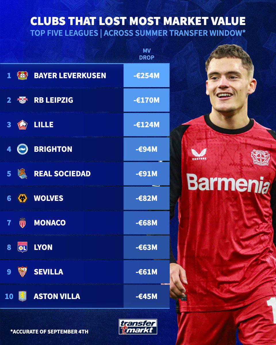 德转统计出夏窗后球队身价跌幅榜TOP10,勒沃库森下跌2.54亿欧居首,莱比锡下跌1.7亿欧排第二,里尔下跌1.24亿欧排第三。
